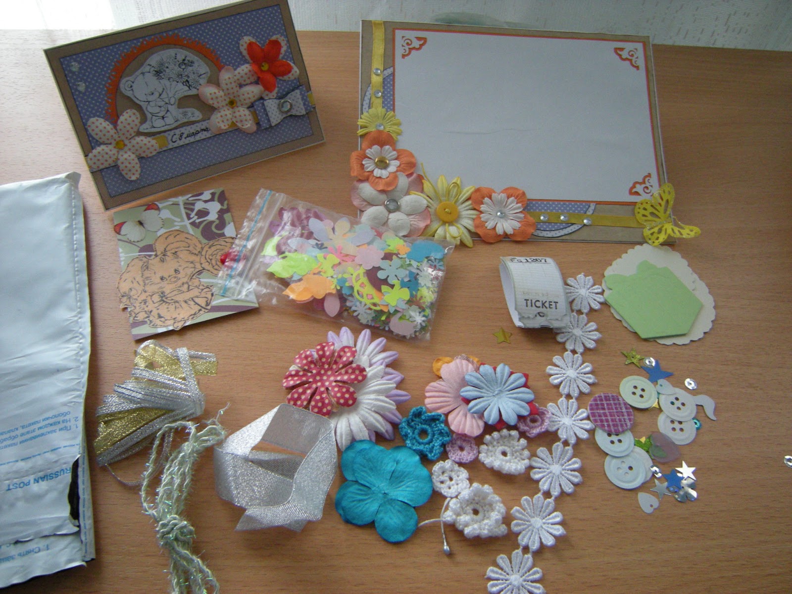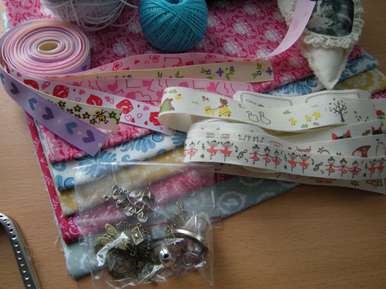 Я считаю, что запасы у мня скромные. Сейчас у меня 12 новых наборов для вышивки, 3 в работе. А так же небольшие запасы тканюшек (выигранные в конфетках и подаренные по обменам), ленточек, пуговиц, шармиков, бусин и др.мелочей.