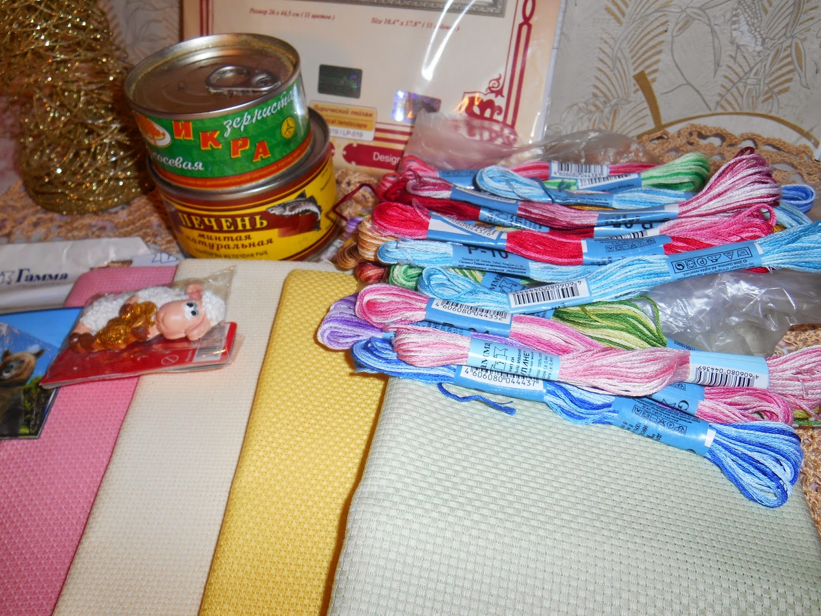 Обалденный Морской наборчик для вышивки! елка так интересно сплетена из проволоки с многочисленными блестками! Большая КУЧА меланжевых мулине и канвы разных цветов и каунтов!Икра к Новогоднему столу!!! УРА! Я давно думаю где бы прикупить икры к НГ по дешевле....цена кусается на неё....А Ирочка, угадала мои мысли на расстоянии! А ещё и баночка печени и икры минтая...